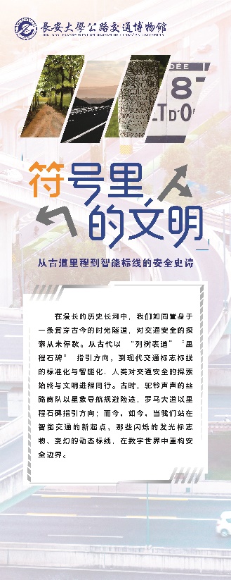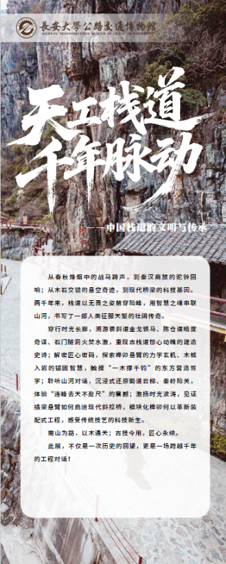5月16日-6月15日,公路交通博物館于一層中廳舉辦“符號里的文明——從古道里程到智能標線的安全史詩”“天工棧道、千年脈動——中國棧道的文明與傳承”科普主題展。展覽結合交通標線、古棧道模型、視頻播放、歷史文化講解,引領觀眾感受交通符號的歷史演變與文化內涵,以及古棧道在結構設計、建筑材料及施工技術等方面的革新與技術傳承。活動旨在增強公眾對中華優秀傳統文化的認同感,助力文化遺產的保護與傳承。