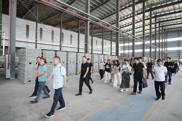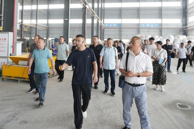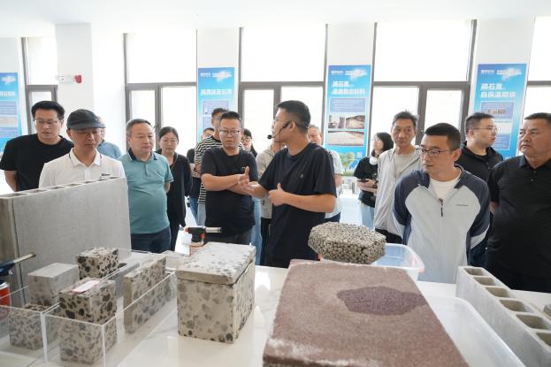 參加活動的代表重點參觀了正在申報待批的全國公路交通綠色低碳技術(shù)示范科普基地——(大悟)磷石膏路用關(guān)鍵技術(shù)研究與應(yīng)用科普基地展廳,觀看了磷石膏產(chǎn)品展示和性能演示。這里將長期大量堆放、占用土地且嚴(yán)重污染環(huán)境的磷石膏,通過改性技術(shù)成功轉(zhuǎn)化為高品質(zhì)的路基材料,來自湖北工程學(xué)院土木專業(yè)的師生紛紛感嘆并驚艷眼前的化腐朽為神奇,不少同學(xué)還動手體驗了磷石膏制品良好的透水性和很強的隔熱耐高溫性能。隨后,代表們觀摩了聚海環(huán)境公司年處理45萬噸磷石膏、產(chǎn)出各類磷石膏制品的生產(chǎn)線,現(xiàn)場了解磷石膏的處理工藝及其制品的生產(chǎn)流程,也見證了聚海環(huán)境公司在綠色新材創(chuàng)新發(fā)展方面取得的卓越成就,基地和生產(chǎn)線切實發(fā)揮著技術(shù)示范作用。