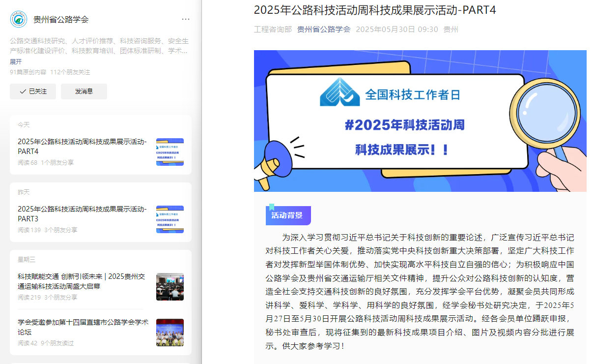 同期,貴州省公路學(xué)會(huì)在微信公眾號(hào)平臺(tái)分批展示所屬會(huì)員單位最新科技成果項(xiàng)目16個(gè),內(nèi)容包括最新科技成果項(xiàng)目介紹、圖片及視頻等內(nèi)容,引導(dǎo)會(huì)員共同形成講科學(xué)、愛科學(xué)、學(xué)科學(xué)、用科學(xué)的良好氛圍。