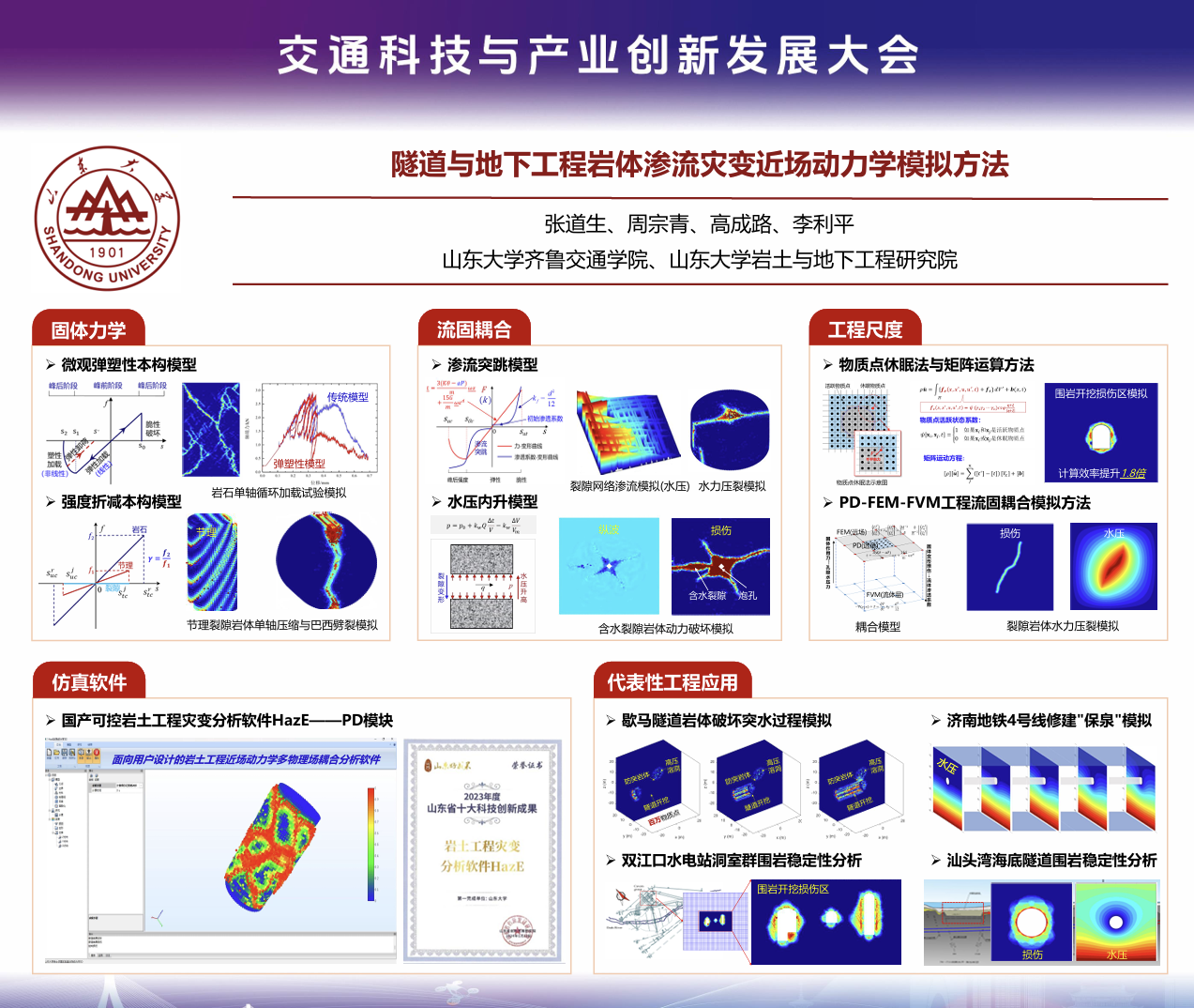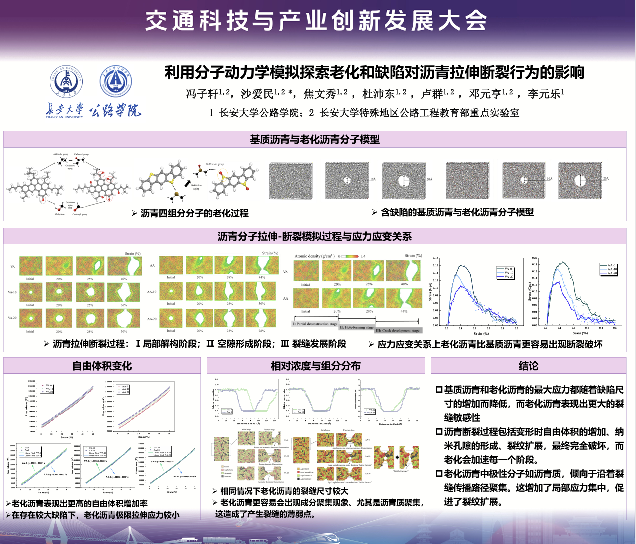 為創新會議組織形式、活躍交流氣氛、提升交流效果,沙龍特別設置了海報展示和互動交流環節。北京航空航天大學副教授周思齊、長安大學博士研究生王騰、山東大學博士研究生張道生、東南大學博士研究生范玉樓、長安大學博士研究生馮子軒、北京交通大學博士研究生郭易東分別圍繞《嫦娥五號高真度模擬月壤制備及燒結應用》《路域太陽能稟賦評估及光伏規劃策略》《隧道與地下工程巖體滲流災變近場動力學模擬方法》《SBS/CR-CSR復合增韌環氧再生瀝青材料設計及性能研究》《利用分子動力學模擬探索老化和缺陷對瀝青拉伸斷裂行為的影響》《超大直徑泥水盾構短螺旋與后置破碎機協同防滯排的機理建模研究》進行海報展示與互動交流,通過面對面的講解與問答不僅拉進了參會者與報告人的距離,也促進了青年學者們跨學科跨專業的交流與合作。