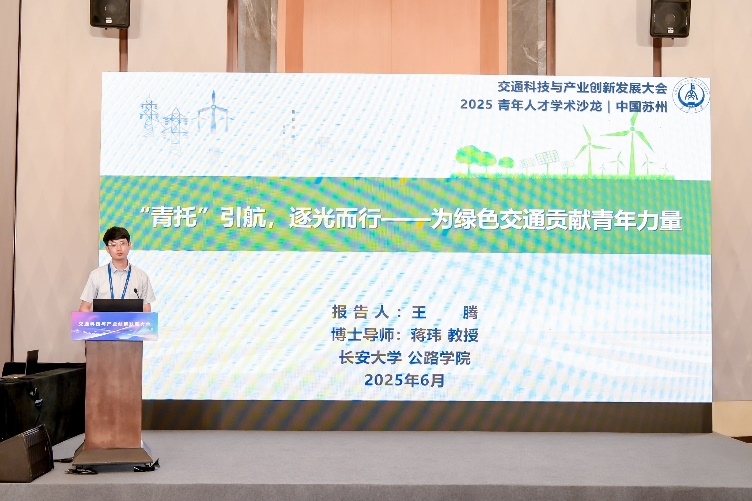 中國科協青托博士生專項計劃入選者、長安大學博士研究生王騰以《青托引航,逐光而行——為綠色交通貢獻青年力量》為主題分享了其在綠色交通領域的創新研究成果。他圍繞"交通能源融合"和"道路廢棄物再生利用"兩大方向,重點介紹了路域可再生能源評估與利用研究,針對道路線性分布特點,提出了路域太陽能資源稟賦評估方法,量化了公路沿線區域構造物的光伏可利用水平,實現了滿足一定自洽率的路域光伏規劃設計并在典型公路場景進行了案例驗證。作為首批博士生專項入選者,他深刻體會到該計劃在拓展學術視野、提升科研能力、構建合作網絡等方面帶來的全方位支持,并表示將秉持"責任、成長、激勵、分享"的理念,繼續深耕交通強國建設和"雙碳"目標實現等國家戰略需求,努力將科研成果轉化為服務社會的新質生產力。