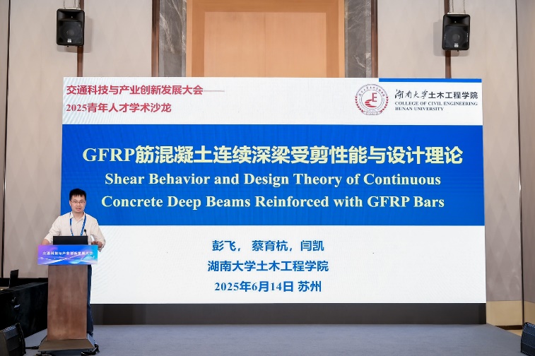 第八屆中國科協青托項目入選者湖南大學副教授彭飛以《GFRP筋混凝土連續深梁受剪性能與設計理論》為主題分享了他在橋梁工程領域的創新研究——采用碳纖維/玻璃纖維復合材料筋(FRP)替代傳統鋼筋,以解決濱海橋梁在腐蝕環境下的耐久性難題。通過22根大尺度梁體試驗,系統研究了FRP筋連續深梁的抗剪性能,首次定量揭示了裂縫演化規律,并建立了更精準的抗剪承載力設計模型。該技術可使橋梁壽命從25年延長至100年,成果已應用于地方標準制定,為應對全球橋梁老化問題提供了中國方案。