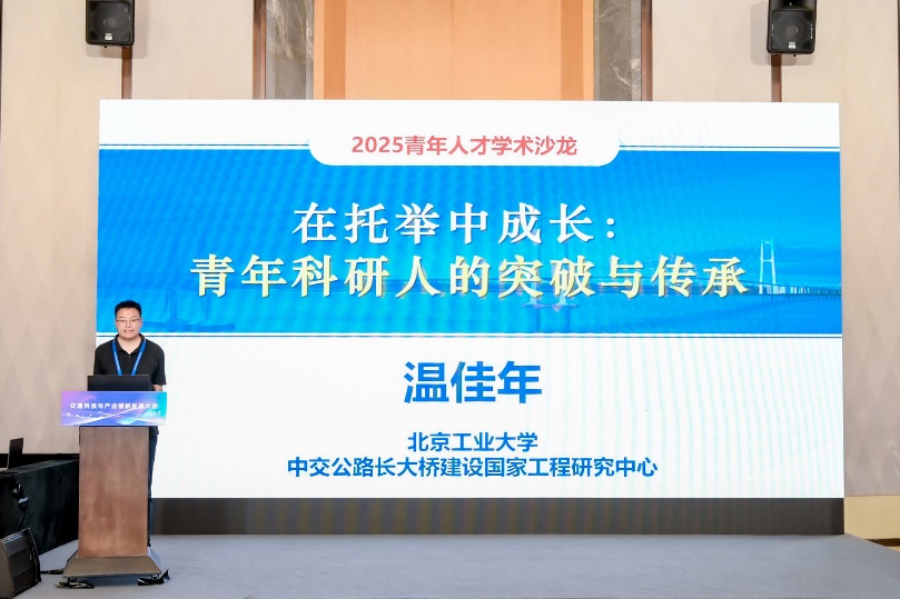 在報告交流環節,第七屆中國科協青托項目入選者同時也是博士生專項計劃托舉導師的溫佳年以《在托舉中成長:青年科研人的突破與傳承》為主題分享了他作為青年科研人才的成長歷程與創新成果。他依托世界最大跨徑懸索橋張靖皋長江大橋,在纜塔自平衡體系、非線性穩定及抗震設計中存在的關鍵科學與技術難題開展研究。托舉期間,發表SCI論文20余篇、出版專著1部,并入選國家級青年人才。作為托舉導師,他指導博士生張強開展橋梁全壽命抗震研究,實現從單一地震研究到地震-腐蝕多場耦合研究的學術傳承,共同發表論文8篇。他強調"里程碑式"科研培養模式,將理論研究與國家重大工程需求相結合,研究成果直接服務于東南沿海的多座跨海大橋設計,為我國交通強國戰略提供了重要的科技支撐。